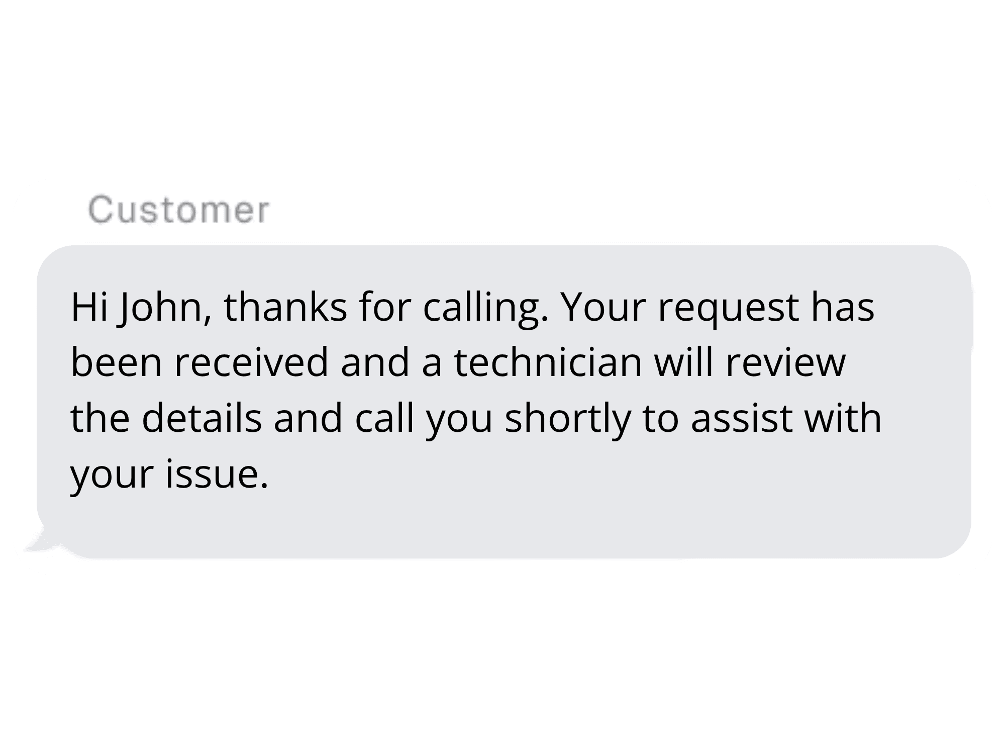 Within 60 seconds of calling, your customer receives a text: "Thanks for calling [Your Business] — someone will reach out to you shortly." They stop looking at other contractors. The job is held. Replace screenshot with a mock SMS thread showing the customer confirmation message.