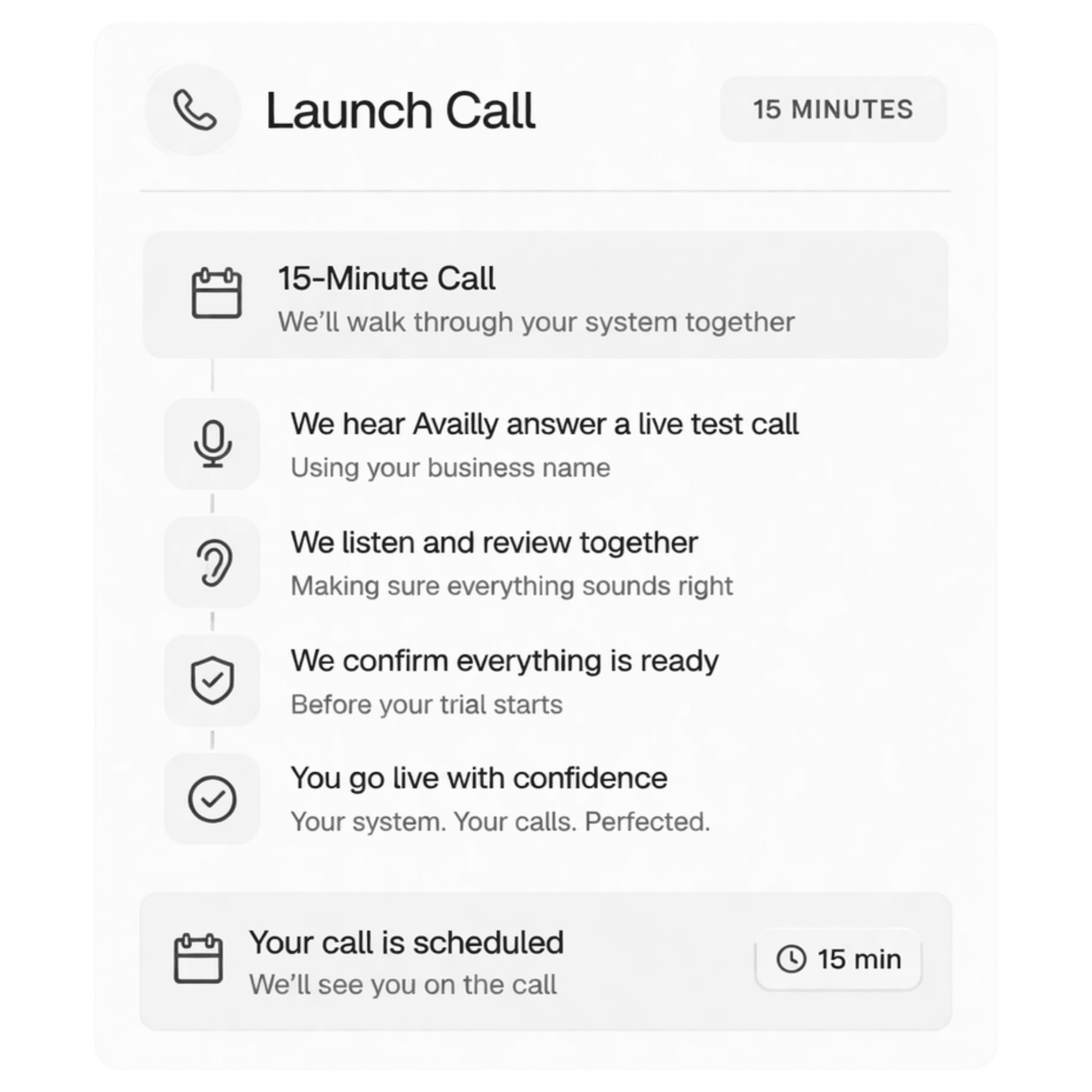 When your system is ready, we walk through it together. You hear Availly answer a live test call using your business name. We make sure everything sounds exactly right before your trial starts.