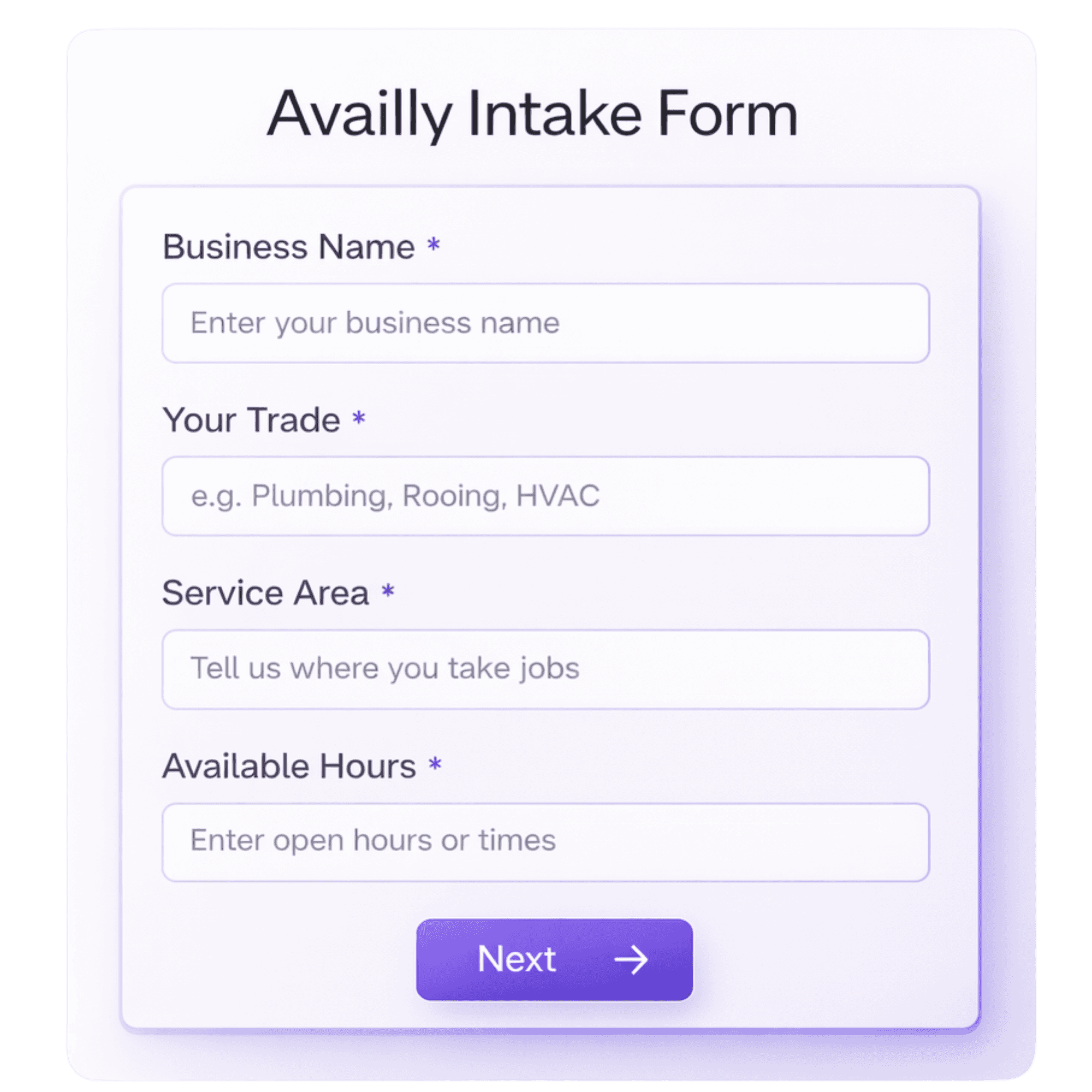 When you can't pick up, Availly answers. It captures the caller's name, number, and what they need then texts you everything in real time. The job stays yours even when you're on one.